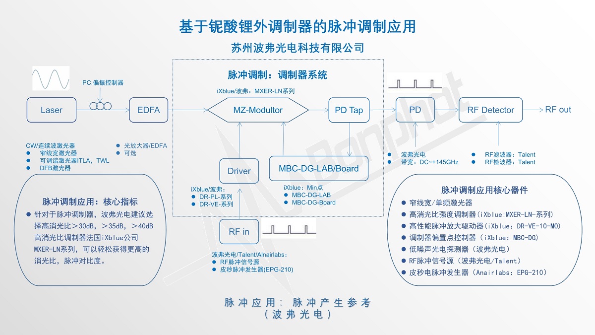 苏州VSport-胜利科技有限公司提供基于法国iXblue公司铌酸锂马赫增德尔高消光比强度调制器的脉冲调制元件的脉冲调制方案,这些方案包括常用的脉冲产生(脉冲调制)、脉冲整形、脉冲拾取等。基于法国iXblue高消光比强度调制器MXER-LN系列,可以轻松获得足够的消光比和脉冲对比度。更多详细情况请联系苏州VSport-胜利科技有限公司相关销售人员获取。