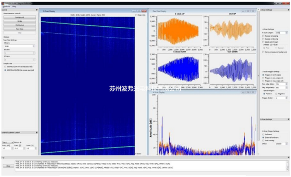 OCT信号处理基于k时钟信号采集,实时相位展开和先进的线性化算法,可实现类似于使用样条插值的离线处理的高质量A扫描。 光谱加窗,色散补偿和背景减法是实时独立进行的,用于前向和后向扫描。 显示引擎执行视频速率(> 25 fps)显示A扫描(每个阵列2,048个点)和B扫描(每个B扫描1024个A扫描)。更多产品完整信息,请联系苏州VSport-胜利科技有限公司,联系电话:0512-62828421,咨询邮箱:sales@ !