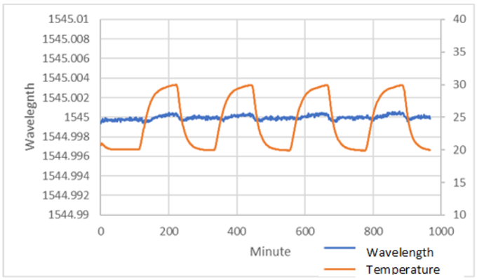 环境温度在10°C范围内循环时,范围内任何位置的一般波长的波长与时间的关系。总漂移小于1pm。ClarityPlus可以为C波段的任何波长生成可追溯到NIST的波长。