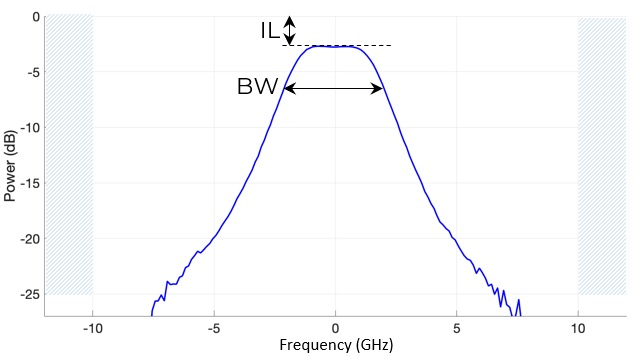 典型响应(IN ➙ OUT):具有改进的Q因子的平顶对称带通设计,可实现更好的选择性和更高的信噪比。 |